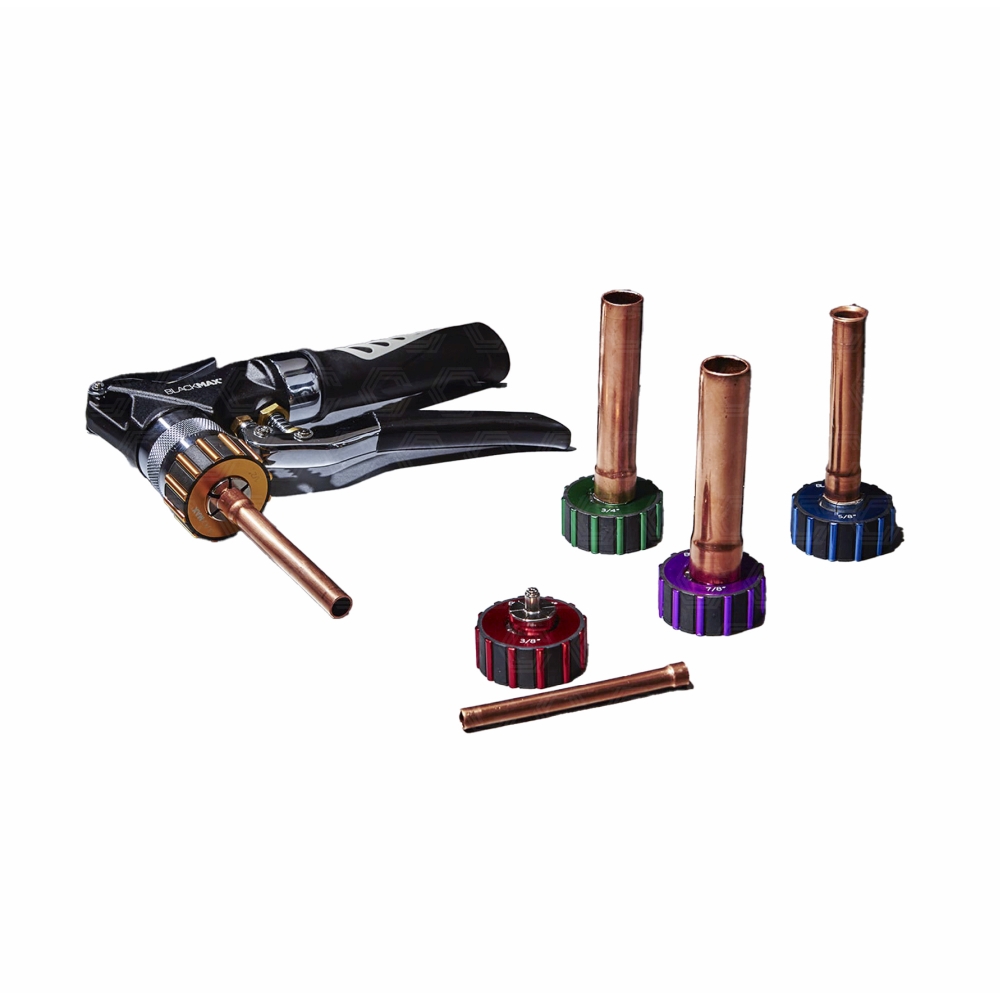 Black Max kézi hidraulikus duzzasztó/tokozó készlet csövekhez A BlackMax BTLH5E hidraulikus tokozó készlet tartalmaz egy prémium hidraulikus szerszámot, amely a hidraulika erejét használja fel a puha réz- és alumíniumcső végeinek gyors és egyszerű duzzasztására. A kész csővégek szükségtelenné teszik a különálló csőszerelvényeket. BTLH5E hidraulikus csőbővítő készlet jellemzői: Prémium, kompakt, öntött alumínium hidraulikus szerszám 5 gyorsan cserélhető, alumínium fej 3/8”, ?”, 5/8”, ?”, 7/8” O.D. cső A fejek megegyeznek a BLACKMAX BTLE9/BTLE9M kézi működtetésű csőtágítóval, és teljesen cserélhetők vele. Az acél bővítőlapátok cserélhetők és megegyeznek a BLACKMAX BTLE9/BTLE9M-ben használt pengékkel Tartalmazza a csősorjázó szerszámot és az öntött hordtáskát The BlackMax BTLH5E Hydraulic Tube Expander Kit includes a premium hydraulic swaging tool that uses the power of hydraulics (fluid compression) to quickly and easily expand the ends of soft copper and aluminum tube for use in HVAC/R systems. Swaged tube ends eliminate the need for separate tube fittings. BTLH5E Hydraulic Tube Expander Kit Features: Premium, compact, cast aluminum hydraulic expander tool 5 quick-change, aluminum heads for swaging 3/8”, ?”, 5/8”, ?”, 7/8” O.D. tube Heads are identical to, and fully interchangeable with BLACKMAX BTLE9/BTLE9M manually operated tube expander Steel expander blades are replaceable and identical to blades used in BLACKMAX BTLE9/BTLE9M Includes tube deburr tool and molded carrying case