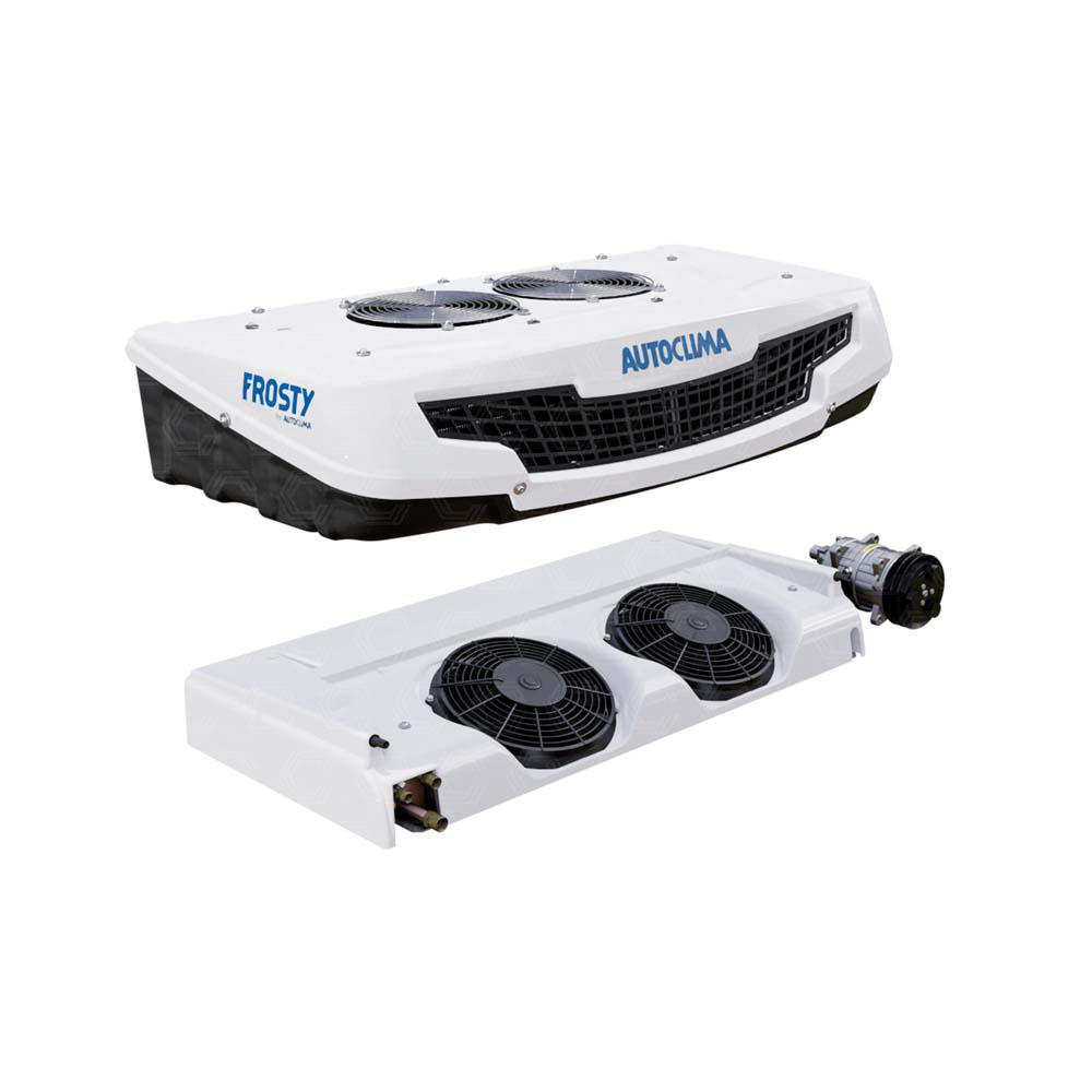Hűtőközeg: R134a, Feszültség: 12V, Alkalmazás: Raktérhűtő készlet, Típus: tetőre szerelhető/homlokfalra szerelhető, Termékcsaládnév: FROSTY RW 451, Fűtés: melegvizes, Tartomány: 0 °C, ATP: rendelhető, Standby: nincs