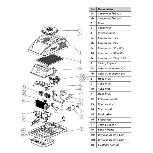 Tetőre szerelhető komplett egység, elektromos kompresszor. hűtés: 3,5kw, 440m3/h, 1560w, áramfelvétel: 65A, 3 fokozat, 24V, szín:fehér. Hűtőközeg: R134a, töltet: 450 gr. A tetőklíma NINCS hűtőközeggel feltöltve! Olaj: FVC68D DAPHNE HERMETIC OIL. Olajjal feltöltve, 100 ml. (Kapcsolódó termék, beépítő készlet: 62700206)