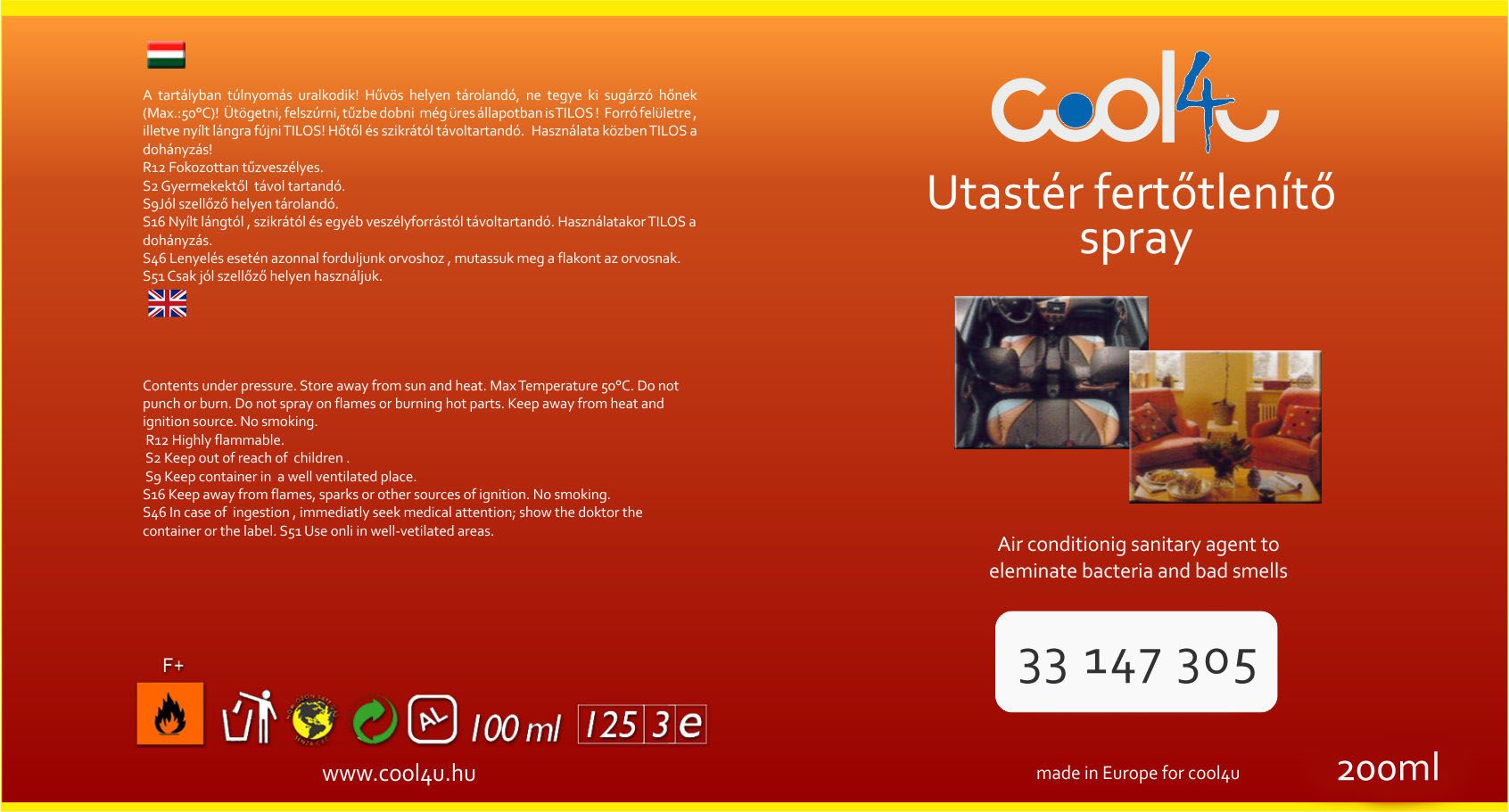 Utastér tisztító spray 200 ml, járművek elpárologtatójának és utasterének illatosítására és tisztítására alkalmas "gránát" típusú spray. 1. Húzza föl az ablakokat és indítsa be a járművet. 2. Kapcsolja be a klímaberendezést a legmagasabb ventilátor fokozaton. 3. Kapcsolja be a belső levegő keringetést. 4. Helyezze a légfrissítőt a klímarendszer levegő szívó nyílásához közel. a spray fölött közvetlen közel ne legyen semmi. 5. Támassza ki a spray-t és nyomja meg a tetején található gombot és csukja be az ajtót. A spray egy nyomásra egyenletes sebességgel kiereszti a teljes tartalmát. az ajtókat még tartsa csukva 5-10 percig és járassa közben a járművet. az eljárás alatt ne tartózkodjon az utastérben.